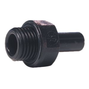 DM Fit 12mm stem x 3/8" BSP stem adaptor manufactured from a black acetal copolymer, which is a safe and non-toxic material suitable for potable liquids and applications involving foodstuff.