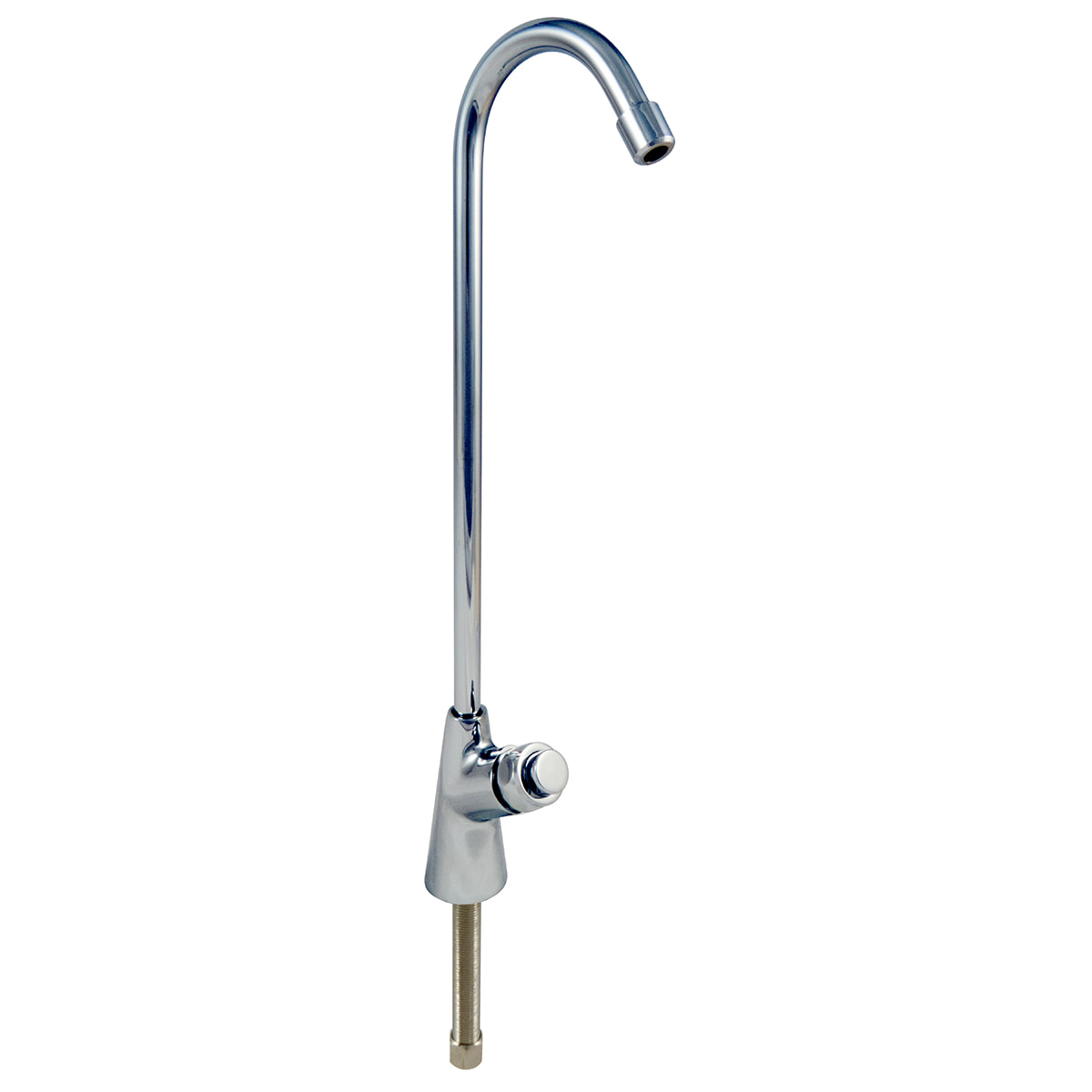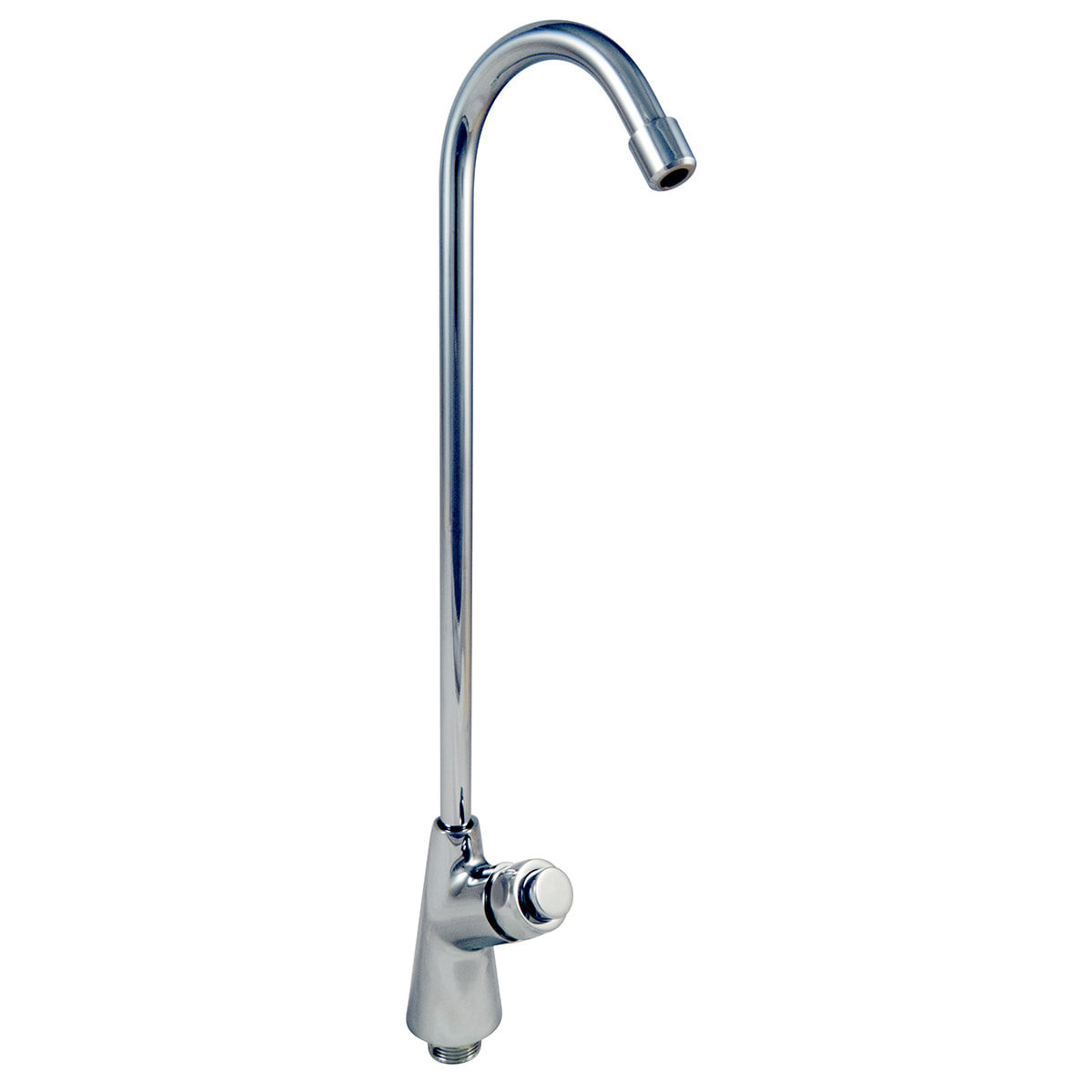 Push button tall spout drinking water fountain taps have a swan neck design and sleek chrome finish.