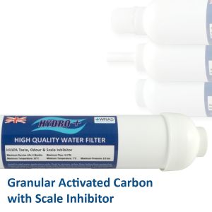 Hydro+ inline water filters, which contain granular activated carbon (GAC) for taste, odour and chlorine filtration.